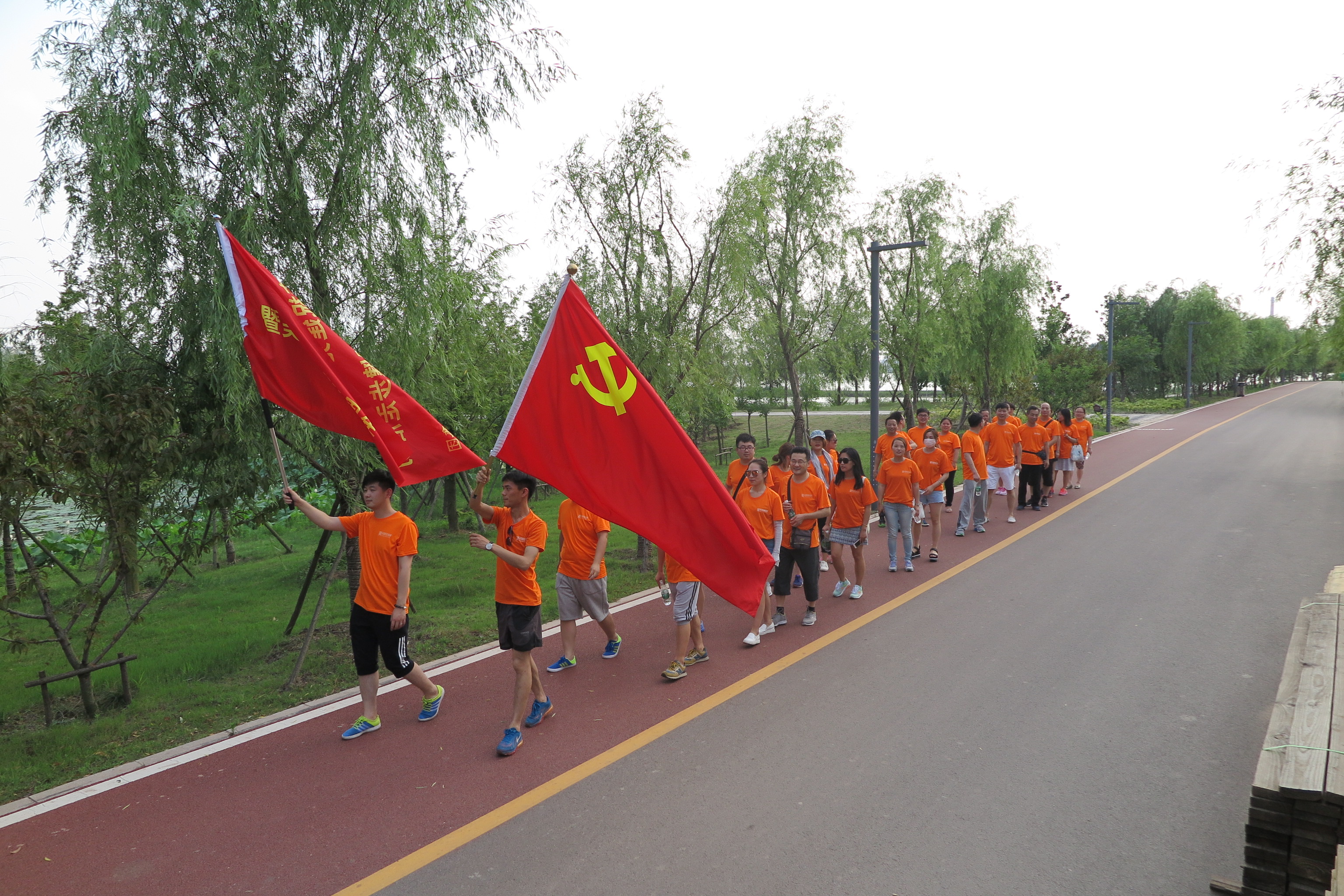 健步活動(dòng)在美麗的南湖公園舉行,橘紅的身影、飄揚(yáng)的旗幟與蔚藍(lán)的南湖融為一體。途中,大家邁著矯健的步伐,高舉黨旗,充分發(fā)揚(yáng)友愛(ài)互助的團(tuán)隊(duì)精神,圓滿(mǎn)的完成了7.5公里的徒步活動(dòng)。雖然酷熱當(dāng)頭,但也更印證了每位員工心中那顆對(duì)黨的火熱的心。健步隊(duì)伍整齊有序、活動(dòng)現(xiàn)場(chǎng)氣氛熱烈,大家昂首闊步,走出了擔(dān)保人的活力和風(fēng)采。